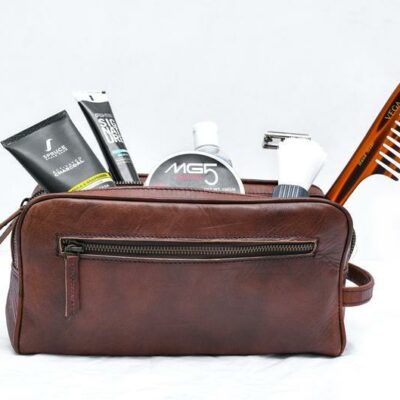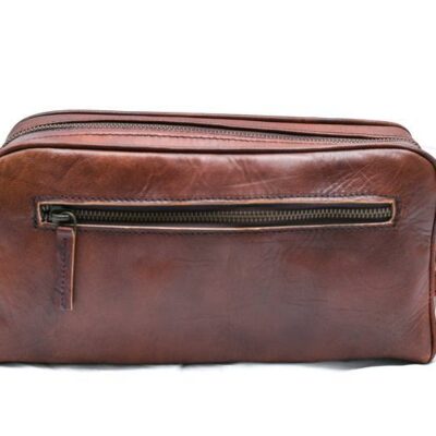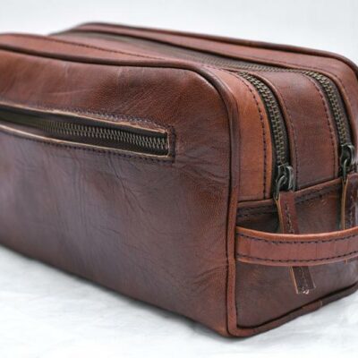 Vintage Brown Leather Toiletry Bag Double Zipper